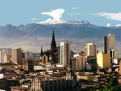 Located in the heart of Colombia's coffee-growing region, Manizales is situated on steep terrain. It provides an overview of high-altitude urban development within a lush agricultural setting.